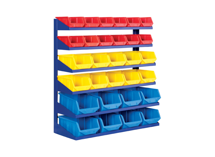 A practical, one-sided shelf made of metal, equipped with plastic containers, perfect for supplying materials during production and assembly, as well as in workshops and warehouses.