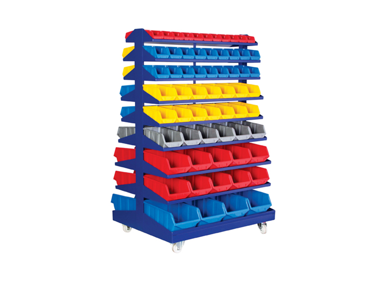 A mobile, double-sided shelf made of metal, equipped with plastic containers, perfect for supplying materials during production and assembly, as well as in workshops and warehouses.