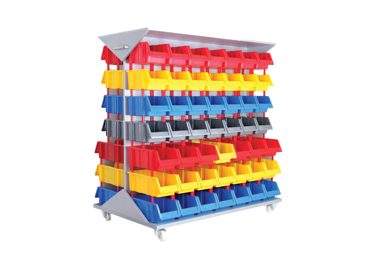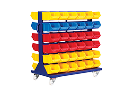 Plastic containers in various sizes and colors can be easily added to the shelving system. The shelves are also available in one-sided, double-sided and four-sided versions, and you can also choose mobile shelves on wheels.