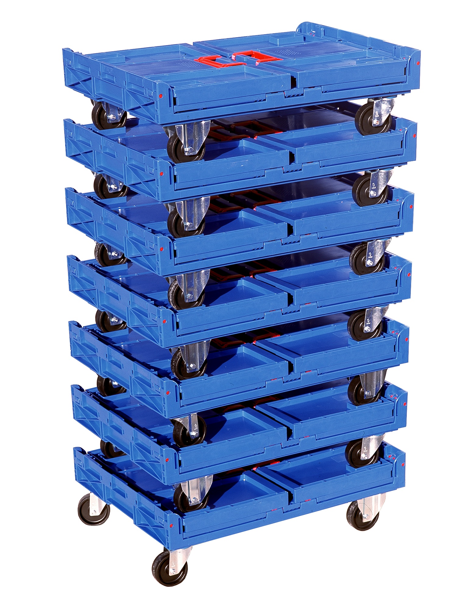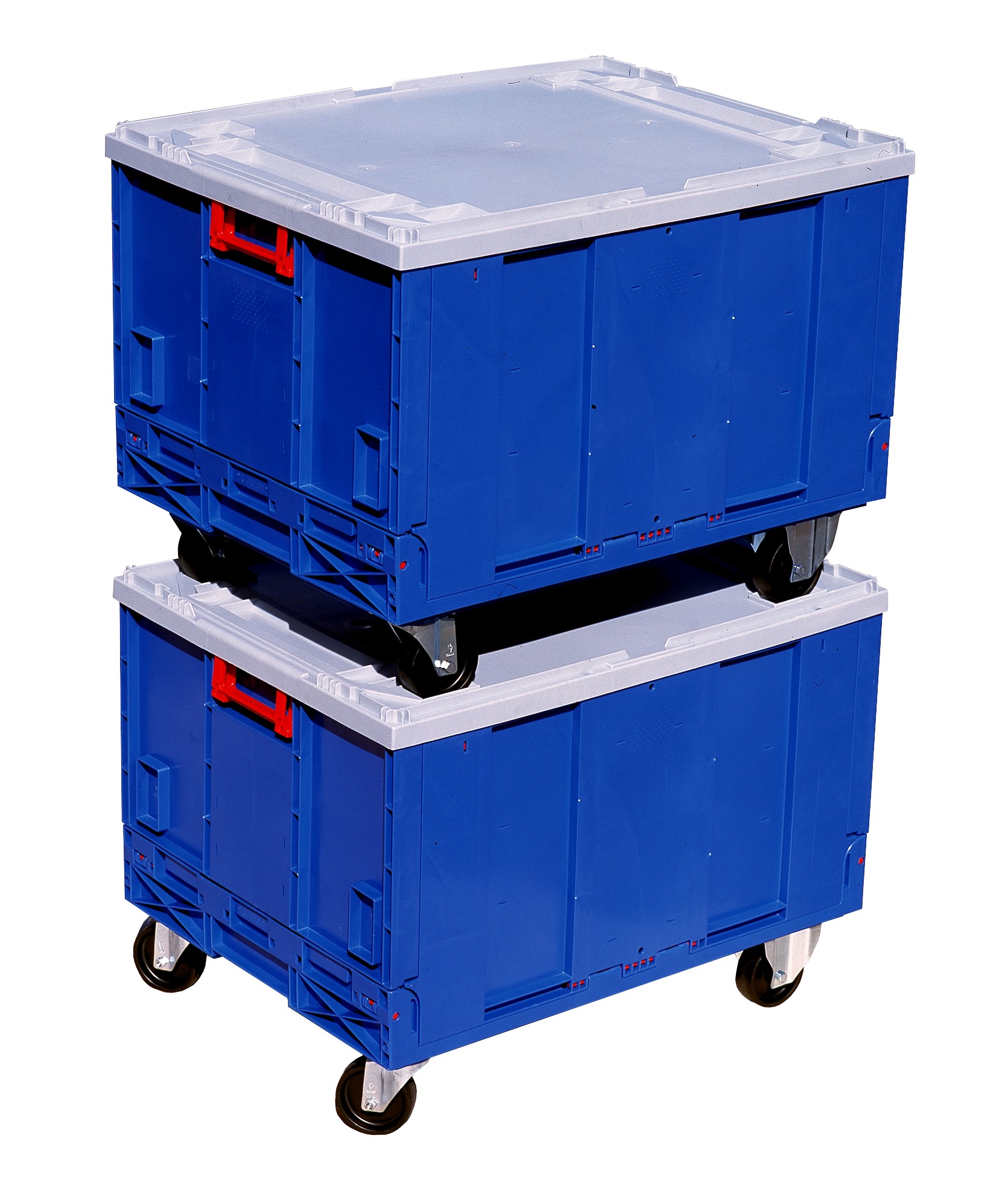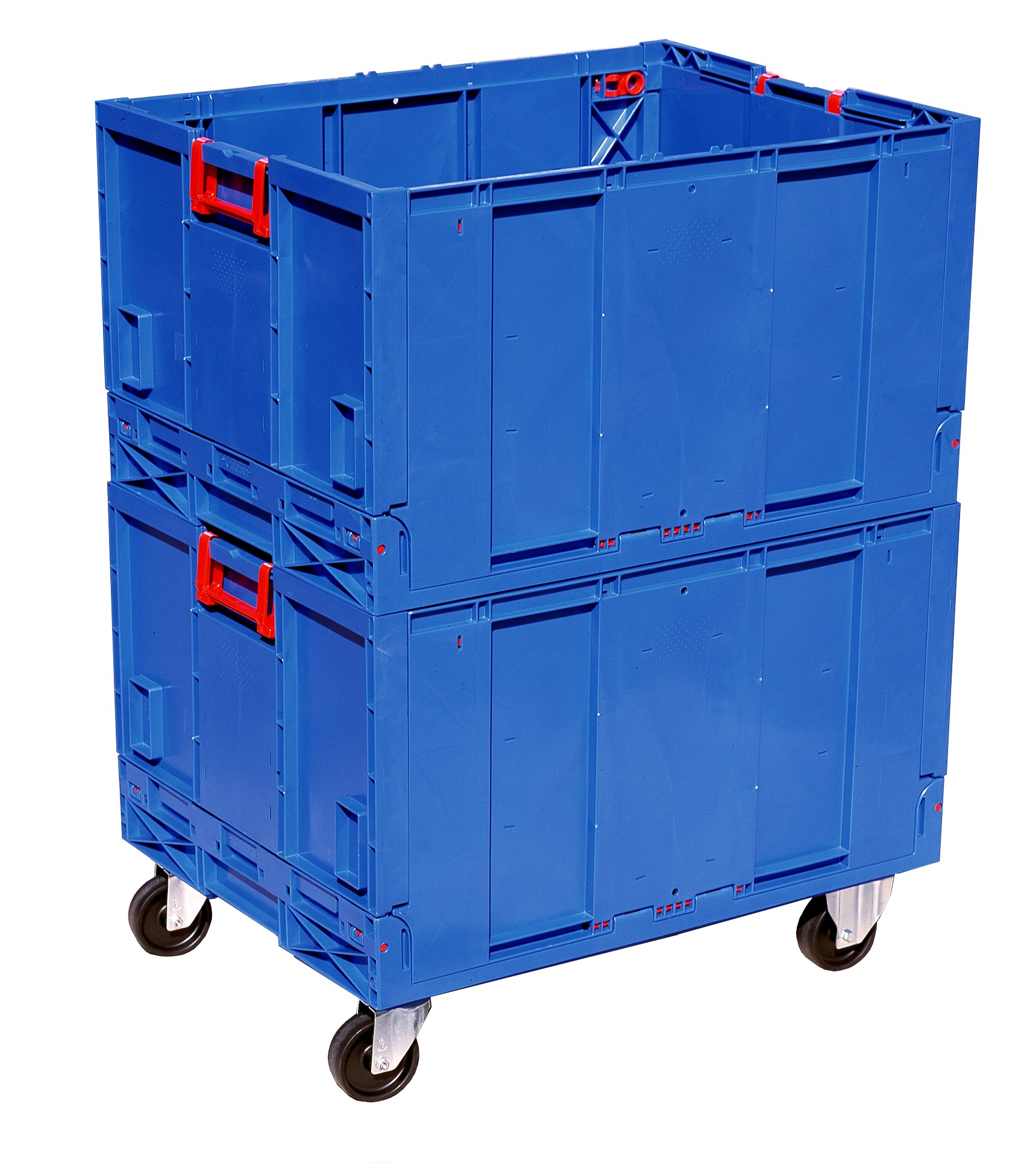 Folding container used mainly in the clothing and automotive industries. Due to its size, it can be used for many applications. When folded, it takes up very little storage space. Thanks to its design, the assembly and disassembly process is simple, very quick and does not require any additional tools. The container does not contain separate elements.