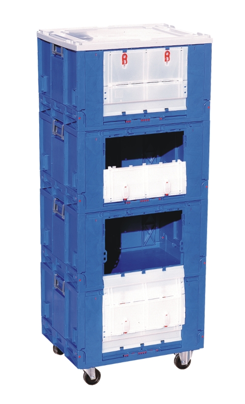 Folding container used mainly in the clothing and automotive industries. Due to its size, it can be used for many applications. When folded, it takes up very little storage space. Thanks to its design, the assembly and disassembly process is simple, very quick and does not require any additional tools. The container does not contain separate elements.